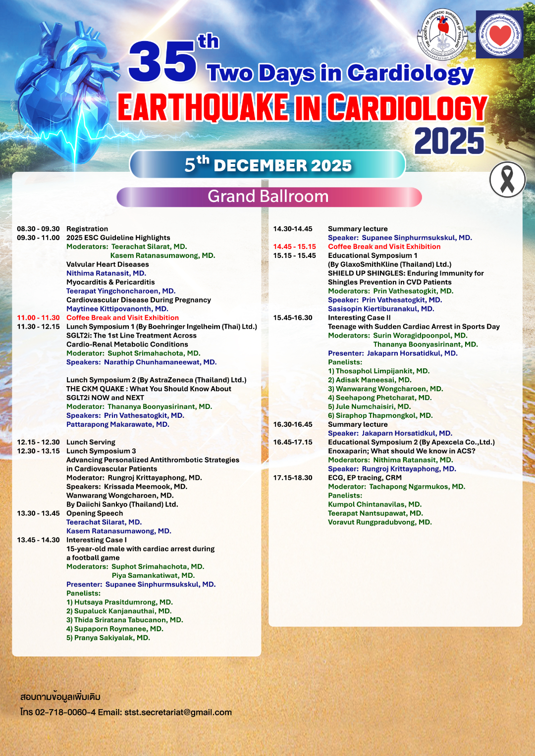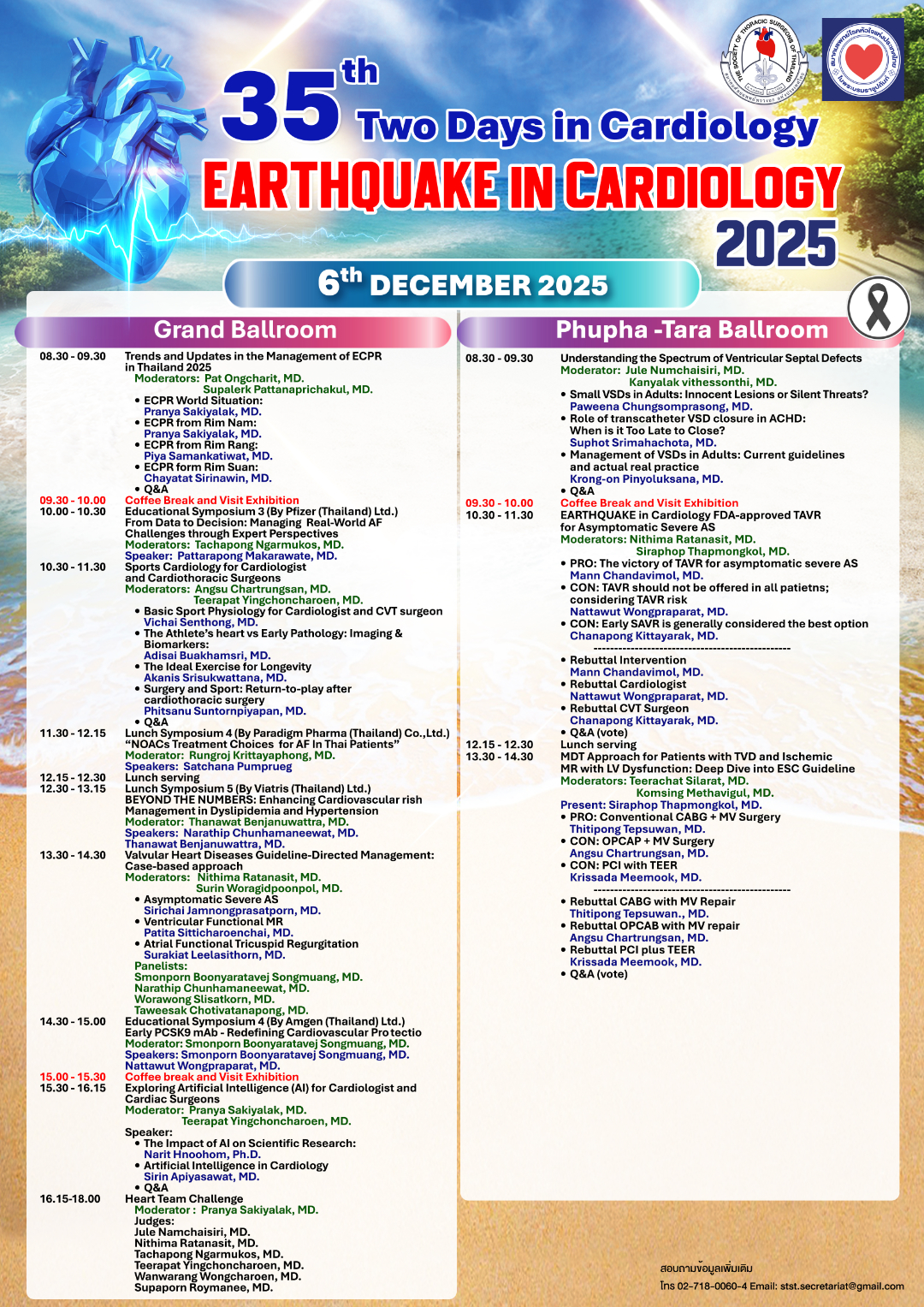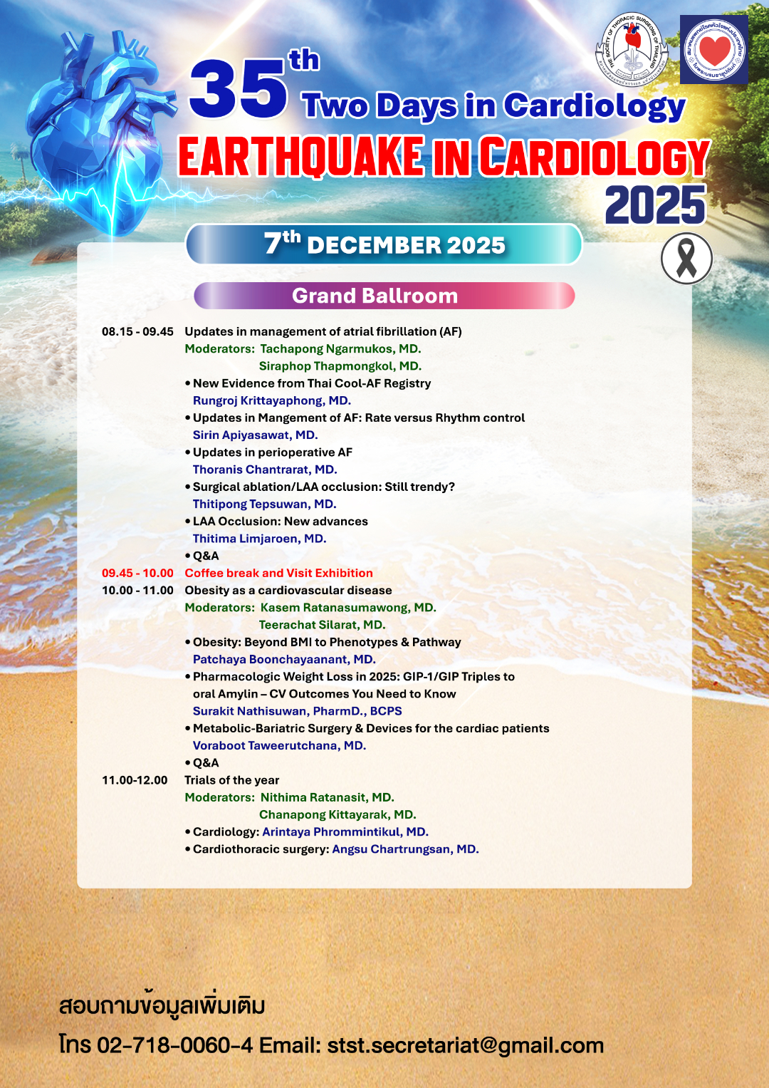 ด้วยสมาคมศัลยแพทย์ทรวงอกแห่งประเทศไทย ร่วมกับสมาคมแพทย์โรคหัวใจแห่งประเทศไทย ในพระบรมราชูปถัมภ์ จะจัดการประชุมวิชาการ 35th Two Days in Cardiology ใน Theme “EARTHQUAKE in Cardiology 2025” ระหว่างวันที่ 5-7 ธันวาคม 2568 ณ ห้องประชุมแกรนด์ บอลรูม โรงแรมระยอง แมริออท จังหวัดระยอง