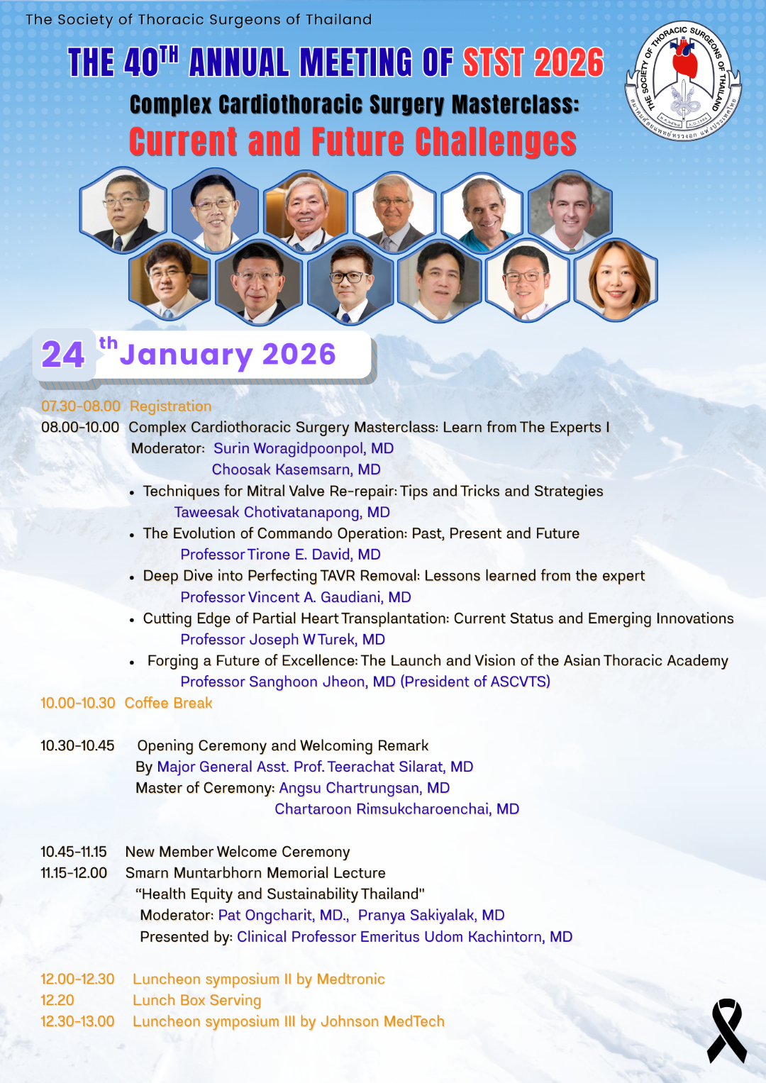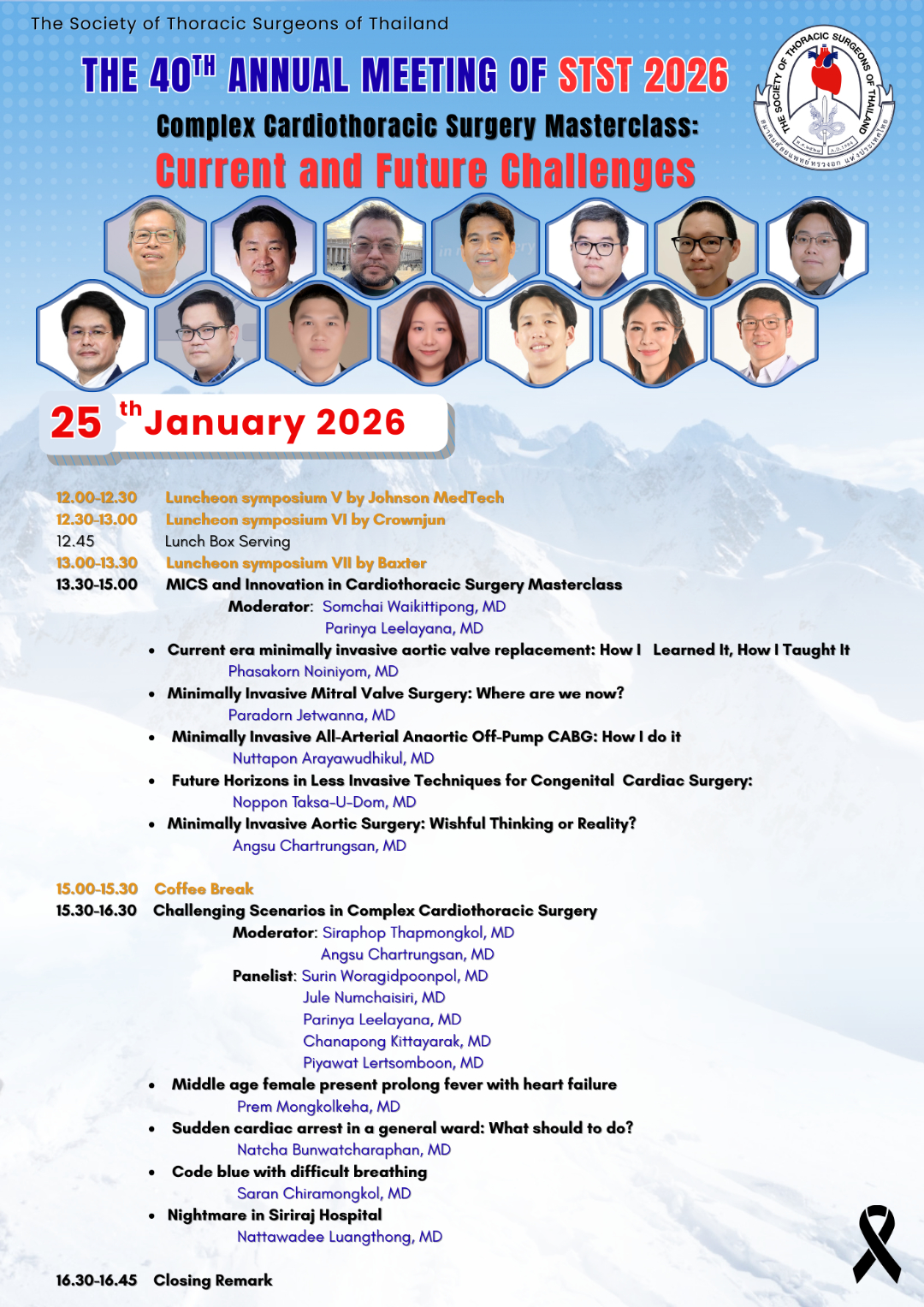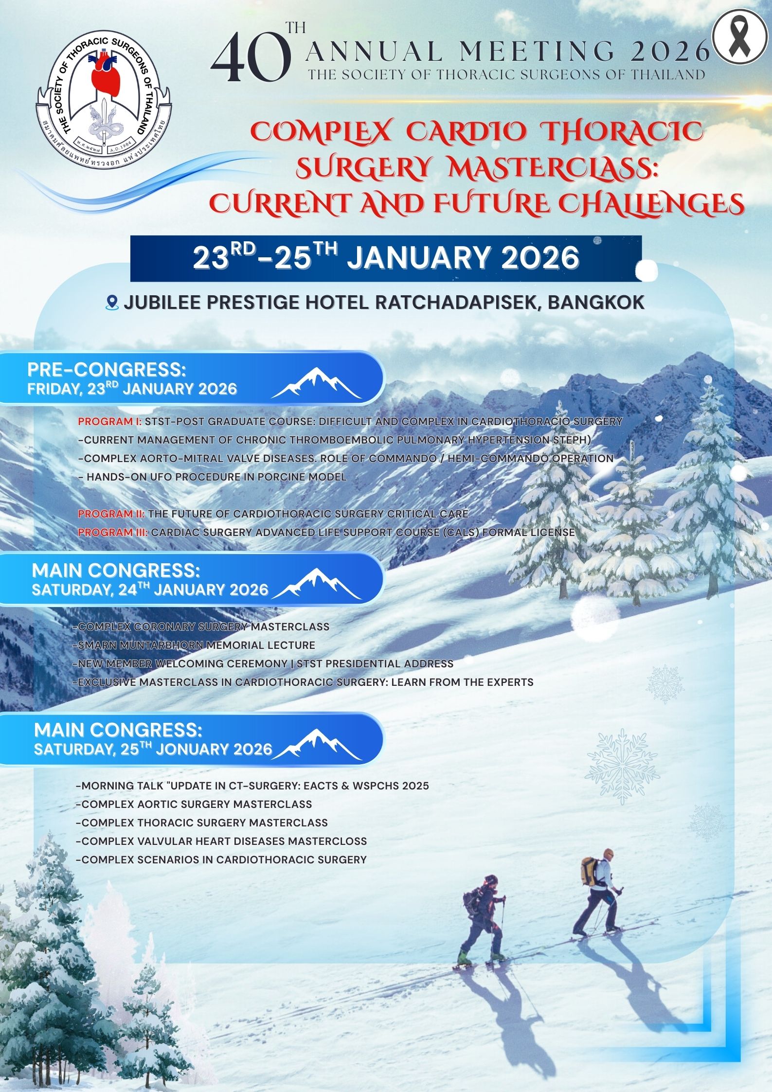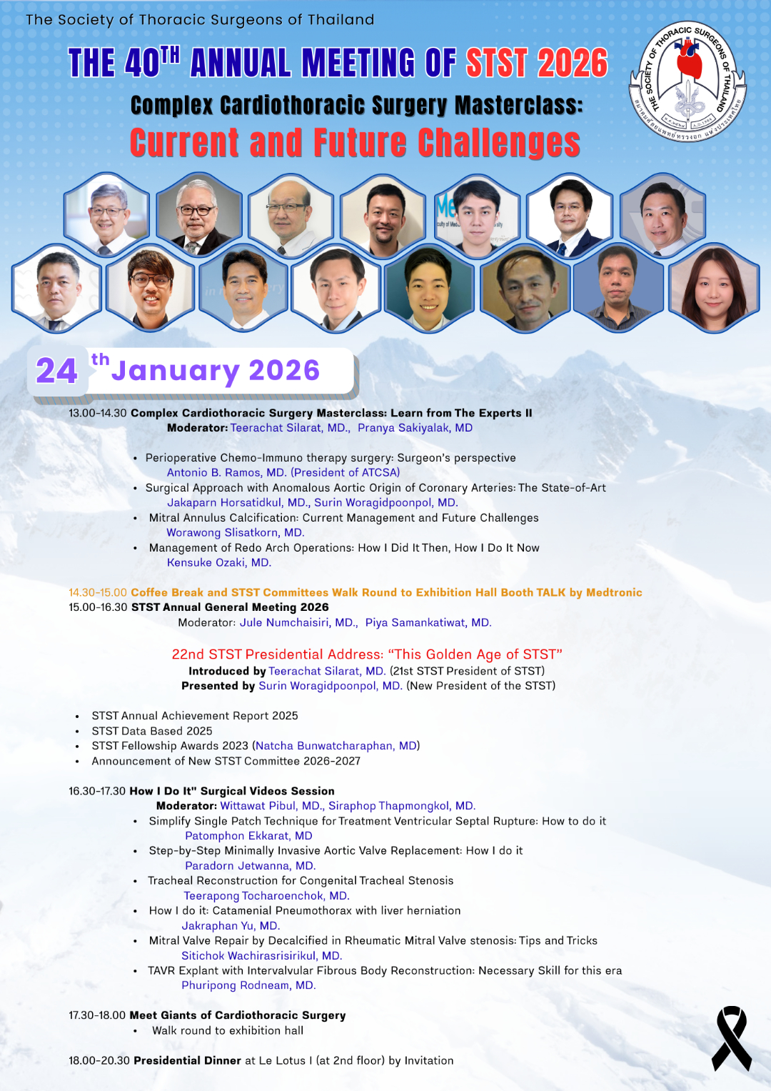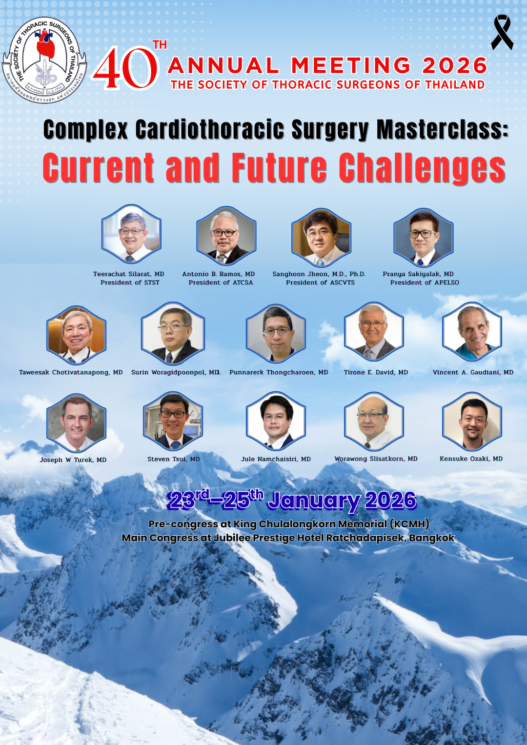 ด้วยสมาคมศัลยแพทย์ทรวงอกแห่งประเทศไทย จะจัดการประชุมวิชาการประจำปี 2569 ครั้งที่ 40 (40th Annual Meeting 2026) ในหัวข้อ“Complex Cardiothoracic Surgery Masterclass: Current and Future Challenges” ในวันที่ 23 – 25 มกราคม 2569 ณ โรงแรม จุบีลี เพรสทีจน์ รัชดาภิเษก เขตห้วยขวาง กรุงเทพฯ
